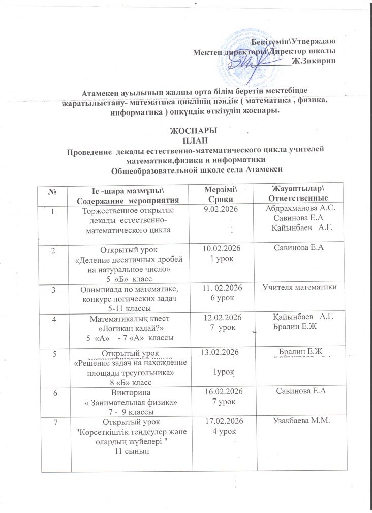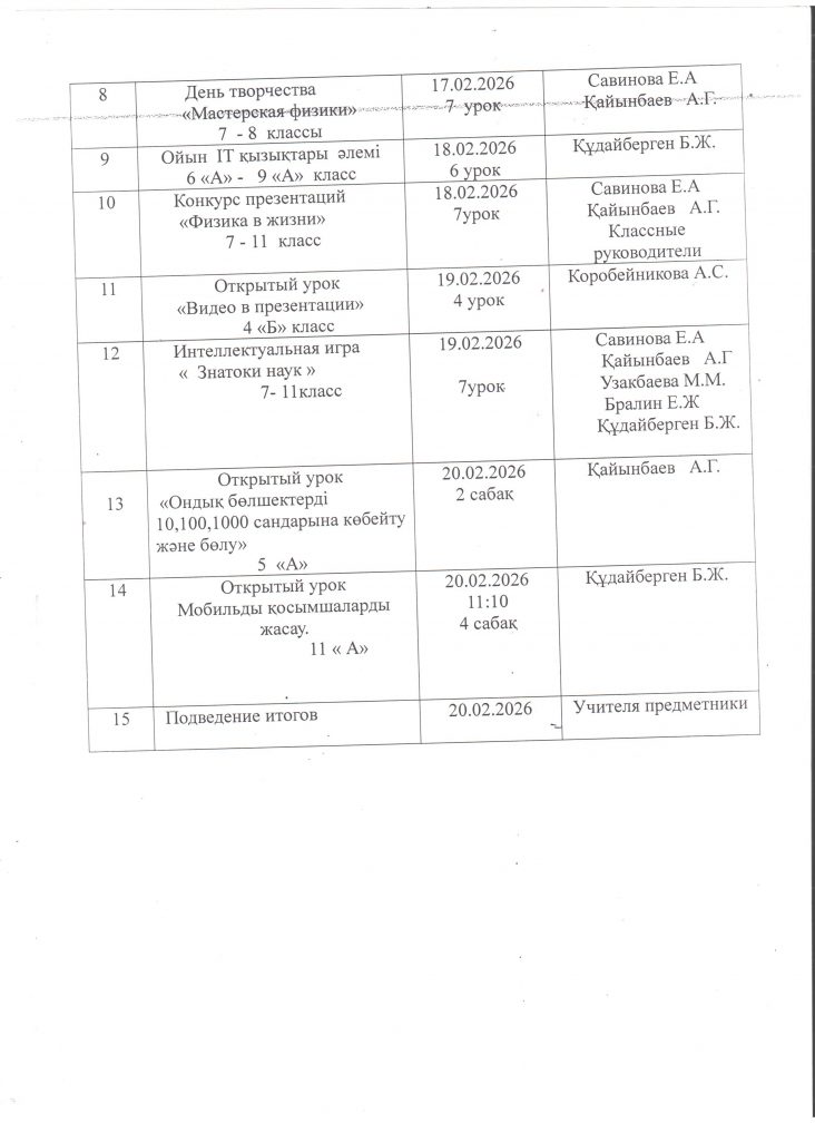 Жаратылыстану-математика циклінің пәндік онкүндік өткізудің жоспары