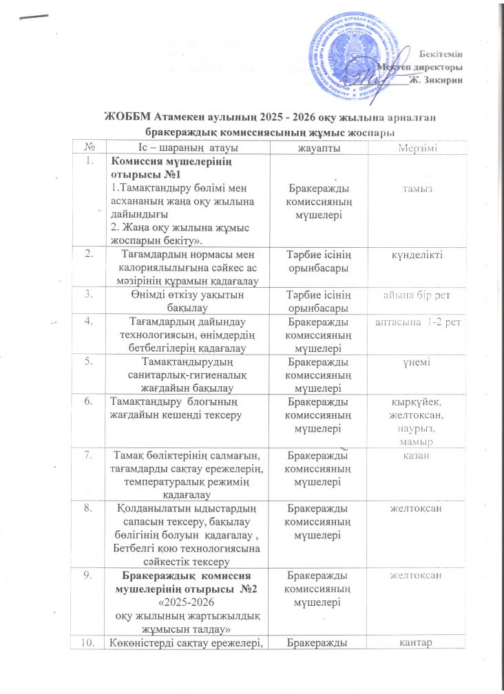 Бракераж комиссиясының жұмыс жоспары