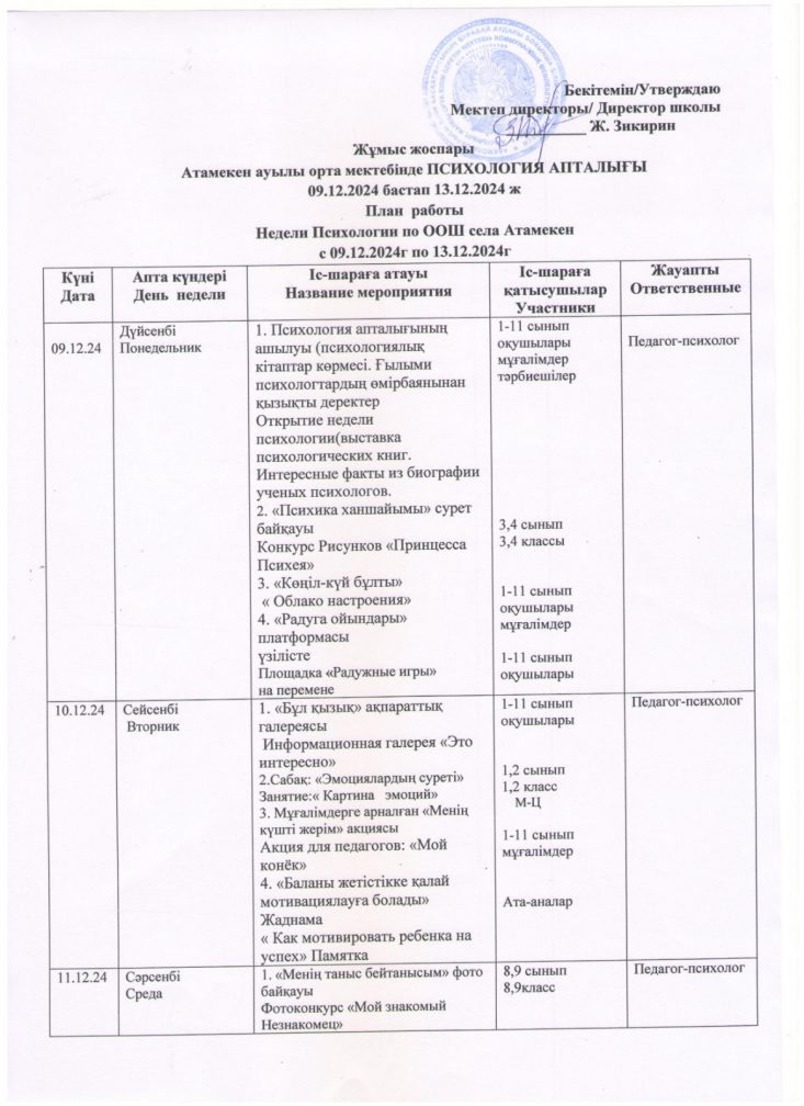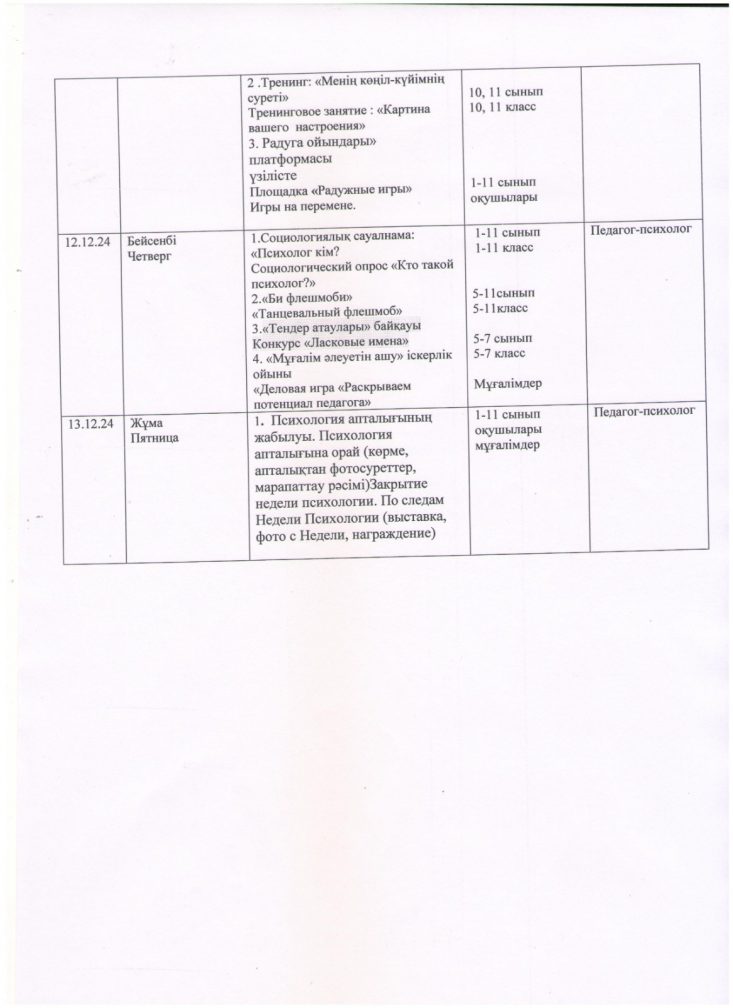 План работы недели Психологиия